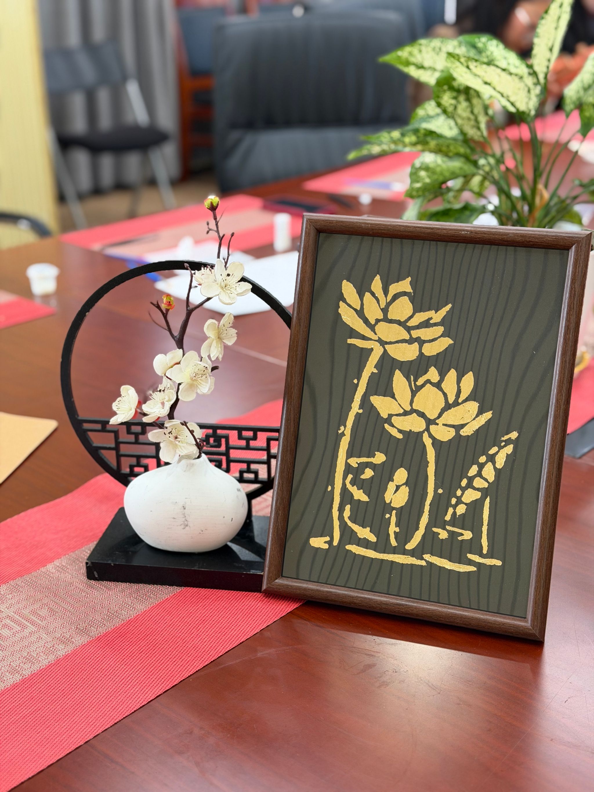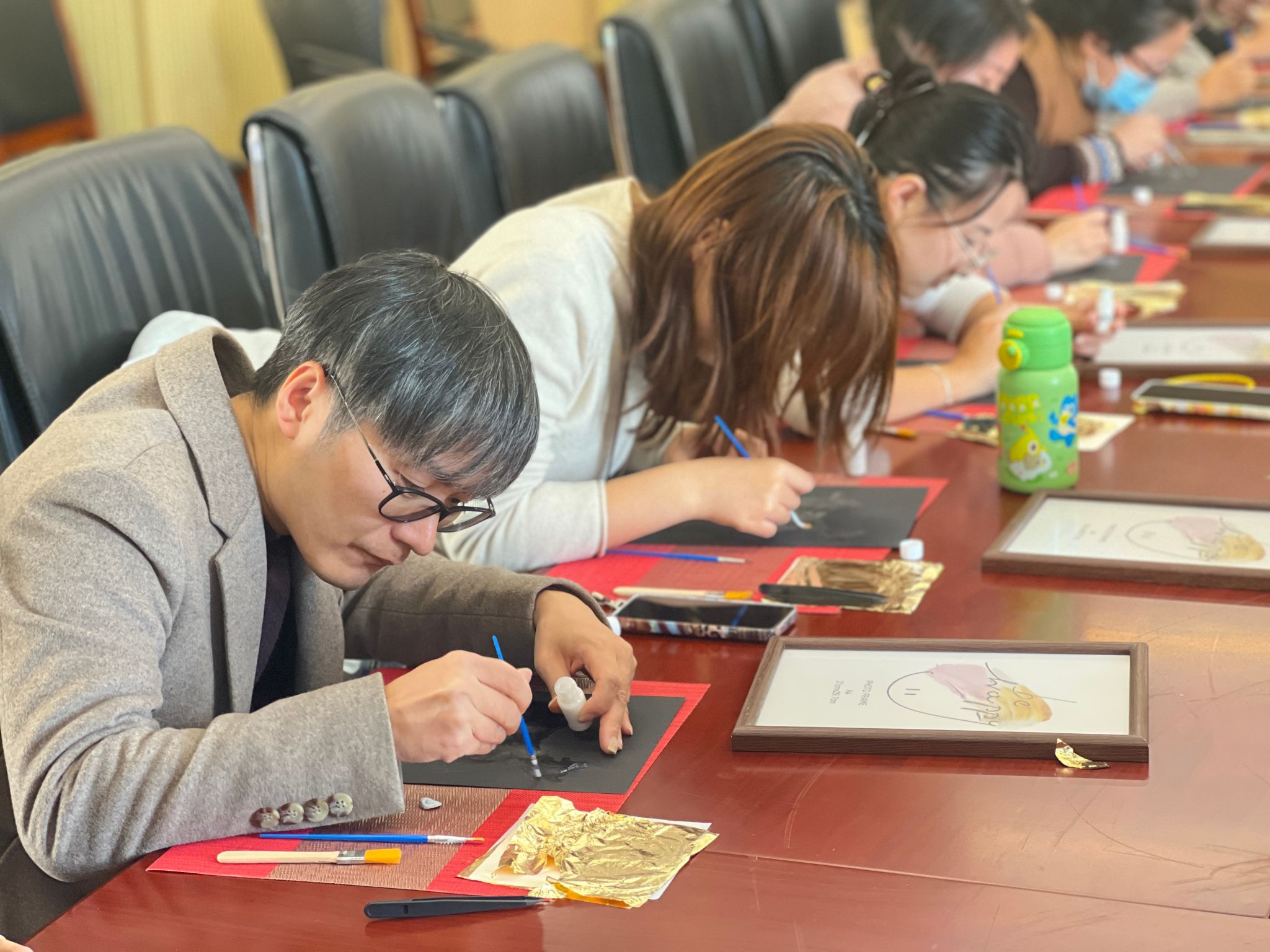 在创作金箔画时,师生党员们化身“非遗学徒”,从勾线、上胶到贴箔、扫箔,每一步都凝神专注。有人选择绘制中国地图,寓意着每一位党员心中那份“一寸丹心图报国”的赤诚与担当;有人选择勾勒挺拔的翠竹,竹节分明的线条里藏着对“守节如竹”的期许;还有人偏爱绽放的青莲,金箔覆上的花瓣泛着温润光泽,恰似廉洁品格的纯粹通透。