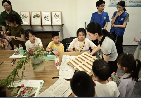 在植物标本室,杨晓东老师团队的研究生为孩子们展示了珍稀植物标本,并讲解了植物的演化与分类知识。他们引导孩子们触摸叶片、观察花朵结构,以此辨别不同植物的特征,让孩子们了解到植物在生态系统中的作用。此外,还指导孩子们学会了制作简易的植物标本。